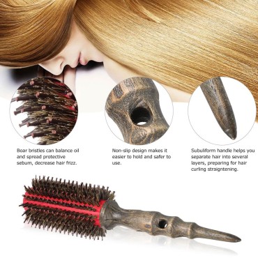 Description:This round comb is designed for curling or straightening hair, with boar bristle hair comb teeth, aluminum tube and wood handle, can massage your head and help you style your hair.