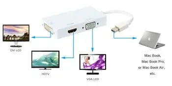 The product is easy and convenient to use, with three output ports s: DVI VGA-HDMI and Mini display port. And you can use one of them at a time when your demand, when you want to use a DVI output, you just need to connect DVI devices using a DVI cable. And when you want to use the HDMI output, you just need to connect the HDMI devices with an HDMI cable. When you want to use a VGA output, you just need to connect a VGA device with a VGA cable. mini-display port meed to connect Mac Book, Mac Book Pro or Mac Book Air.